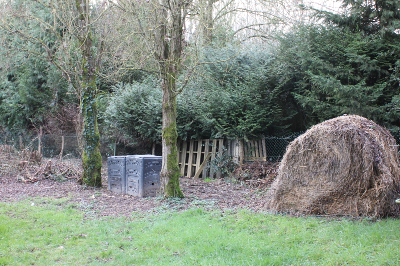 Sur le coté, à droite de la maison : le coin un peu technique. Un rouleau de paille pour le paillage et 2 silos à compost. Ces silos je l’ai acheté il y 2 ans lorsque nous avons voulu optimiser le compostage. Avant nous faisions un compost en tas. J’ai souhaité le rapprocher de la cuisine pour plus de praticité. Mais il fallait que ce soit plus esthétique. Bon j’avoue que le choix des silos en plastique n’est pas esthétique et que si je le refaisais, je choisirais du bois. De plus ces silos sont trop petits pour assurer le compostage des restes de cuisine et des matières vertes provenant du jardin. Donc l’année dernière, nous avons rajouté un compost par le tas derrière les 2 silos. Nous venons de l’étaler dans le jardin pour faire de la place.