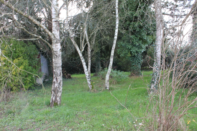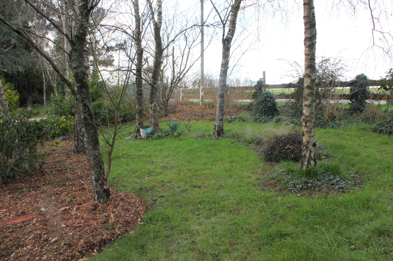 Devant : une zone un peu plus « travaillée », « paysagée » où je fais cohabiter des plantes plutôt de terres acides : rhododendron, hortensia, bruyères, azalées … sous des pins et bouleaux. Les arbres étaient déjà là et ils m’ont inspiré les paysage de landes de mon enfance et l’été lorsque le soleil chauffe le paillage, je m’y retrouve …