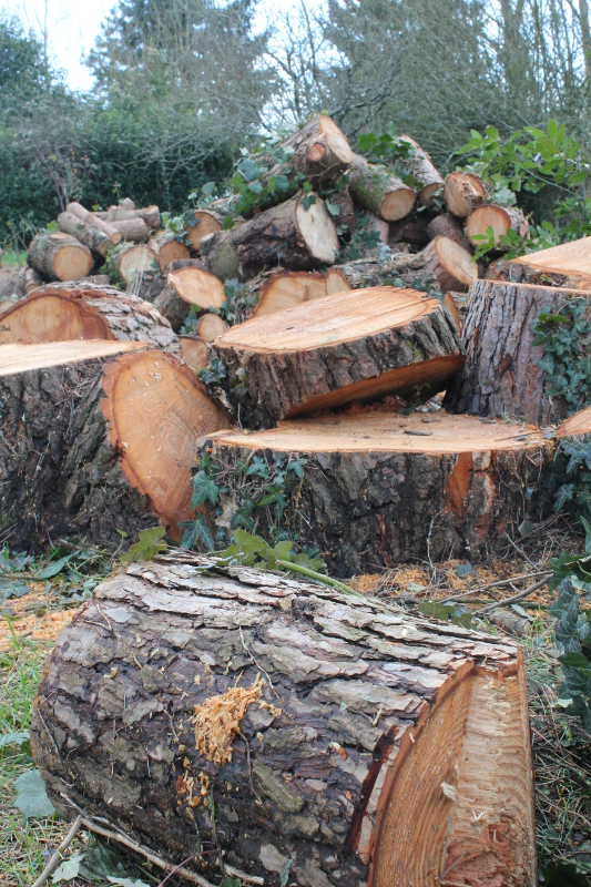 – tout va être réutilisé sur place : des rondins pour la déco ou en bois de chauffage, des mètres cube de paillage pour avoir moins d’entretien des plates bandes, et des planches pour faire des constructions (cabane pour les enfants, composteur, cabanes à outils, bac de jardinage …. rien encore de bien défini).